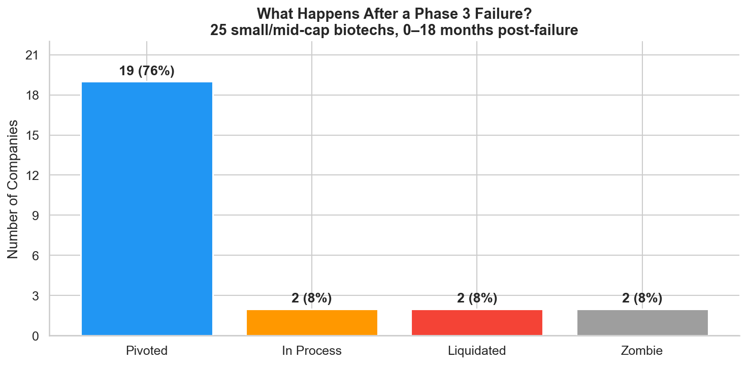 We tracked 25 small- and mid-cap biotechs through the 18 months after a Phase 3 failure, using SEC filings to reconstruct each company's post-failure timeline: restructurings, capital raises, strategic reviews, and pipeline pivots.