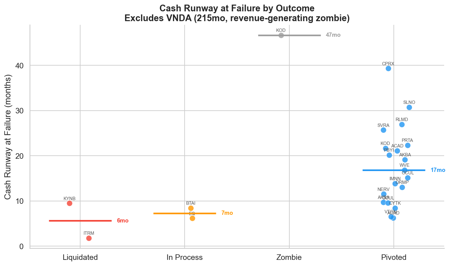 The zombie companies, KOD (Kodiak Sciences) and VNDA (Vanda Pharmaceuticals), sit at the opposite extreme. KOD had $672 million in cash and 47 months of runway after their -82% crash. VNDA's revenue base, HETLIOZ (tasimelteon) and Fanapt (iloperidone), meant the company could sit indefinitely with 215 months of runway. Both companies took essentially no corporate action in the 18 months following failure.