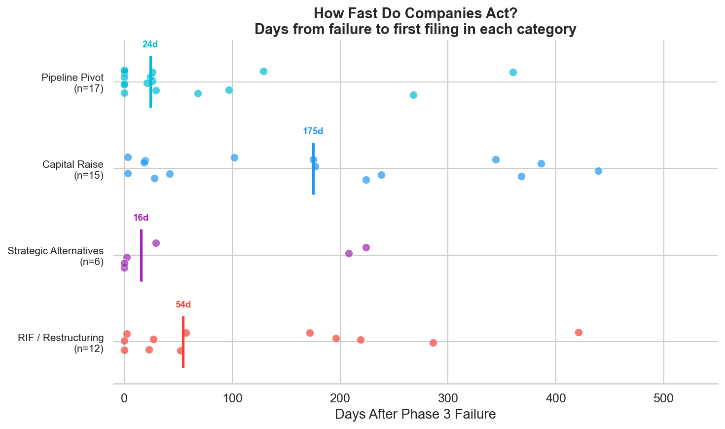 Companies don't wait. The median time from failure to the first restructuring action (RIF or strategic alternatives announcement) is roughly 30 days. Capital raises follow within the first few months. Pipeline pivots, such as advancing a backup asset, filing a new IND, or signing a collaboration, take longer, with a median around 6 months.