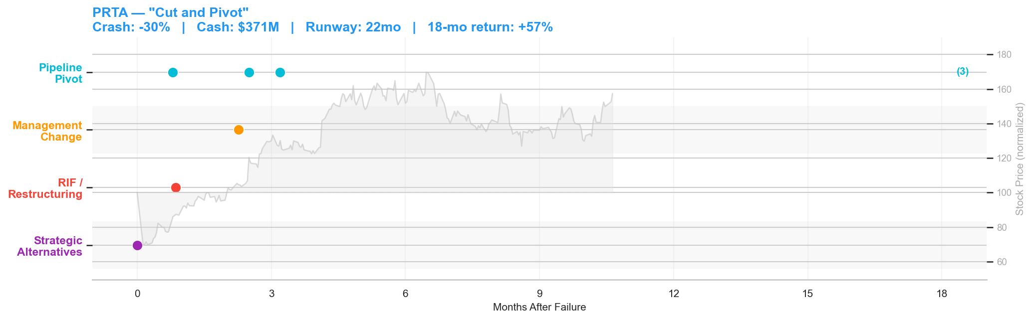 Figure 4: Prothena post-failure timeline. Crash: -30% | Cash: $371M | Runway: 22 months | 18-month return: +57%.