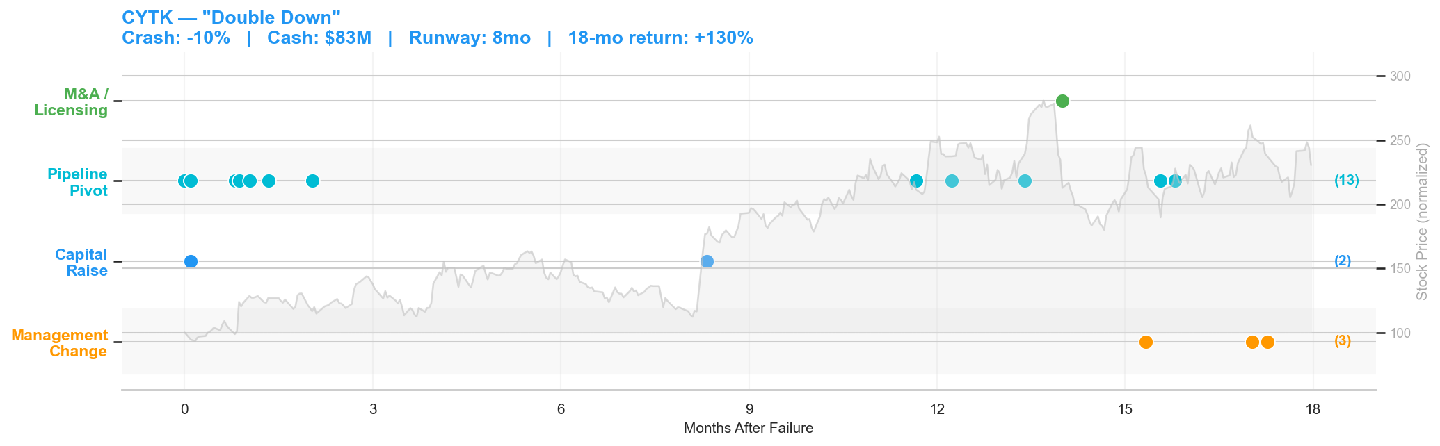 Figure 5: Cytokinetics post-failure timeline. Crash: -10% | Cash: $83M | Runway: 8 months | 18-month return: +130%.