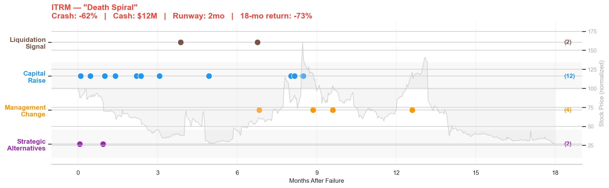 Figure 6: Iterum post-failure timeline. Crash: -62% | Cash: $12M | Runway: 2 months | 18-month return: -73%.