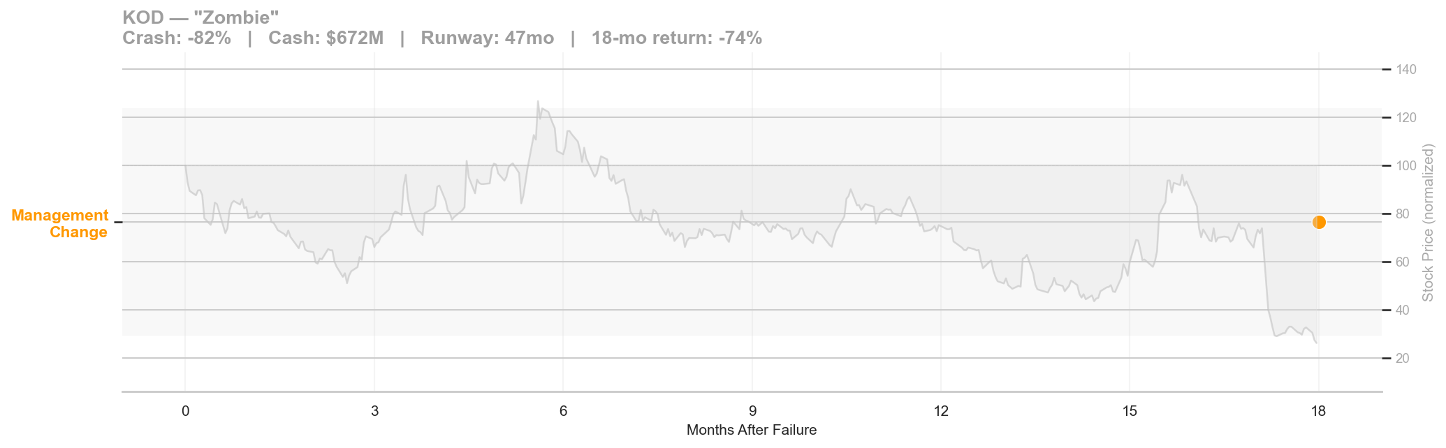Kodiak eventually announced a second Phase 3 attempt at tarcocimab in November 2023 (captured in our dataset as a separate failure event when that too struggled). The zombie archetype is defined by the gap between resources and action: plenty of cash, no urgency, and a stock that bleeds value while the board deliberates.